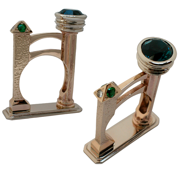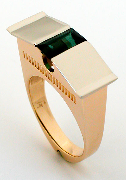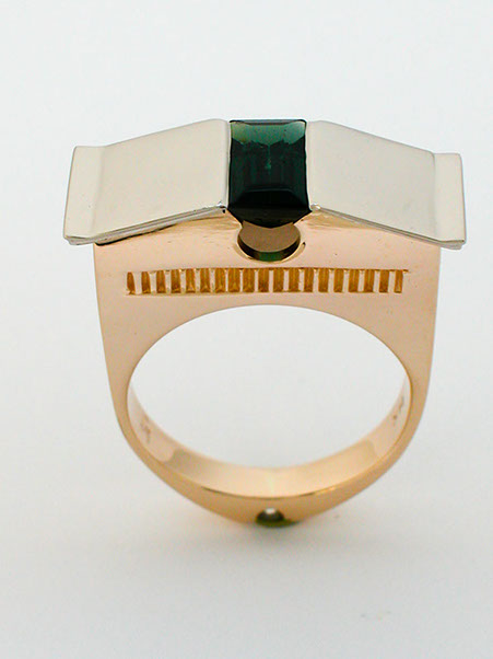 AT&T Building Architecture Ring. View 2. Gold, white gold, tourmaline with a diamond on bottom. Based on Phillip Johnson's building in New York City. c.1995