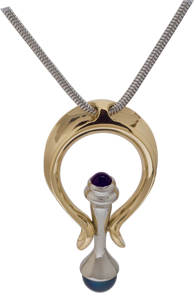 White and Yellow Gold Pendant with movable center holding black pearl and amethyst.