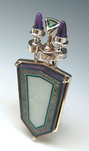 White and Yellow Gold Pin with laminated opal with sugilite, malachite, onyx, pearl, diamonds, tourmaline. c. 1999.