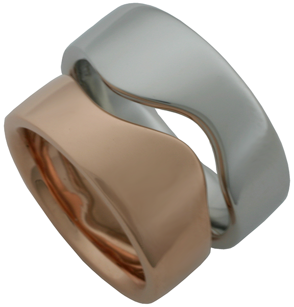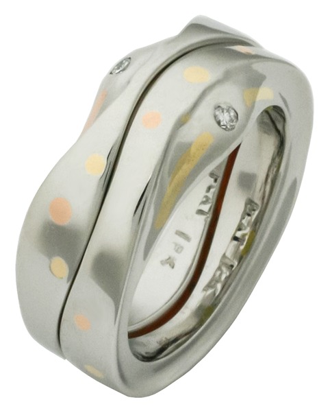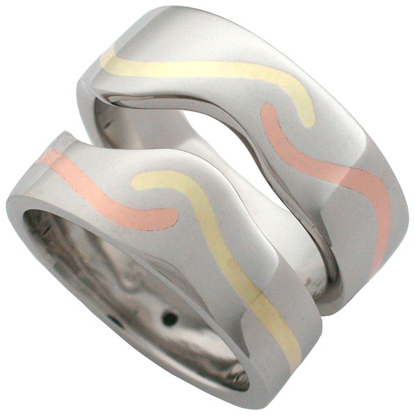Platinum fitting wedding bands with rose gold and yellow gold insets.