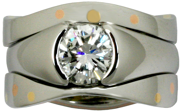 Three platinum fitting rings, engagement ring with large diamond and wedding bands with diamond, yellow and rose gold insets.