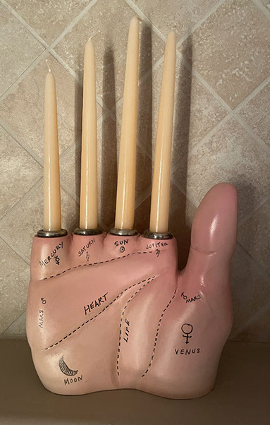 Fortune Teller Candelabra, wood, paint, ink, silver, candles, 2021