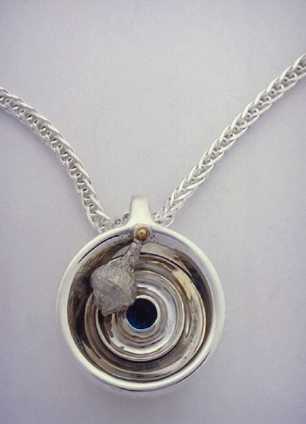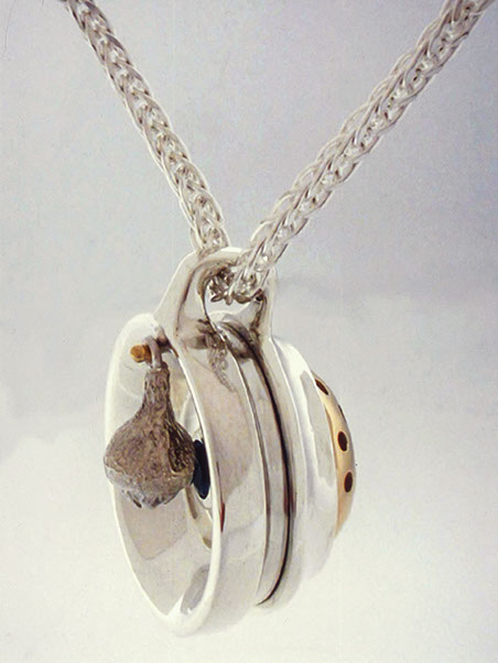 Heirloom Wearable Baby Rattle #3, 2000. Back side showing tiny shell and gemstone. Silver, Gold, Gemstones.