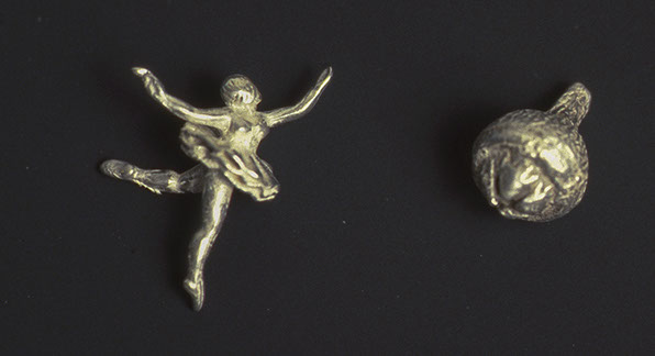 Heirloom Baby Rattle #1, 1997, Contents of the rattle balls: ballerina and acorn, Sterling Silver.