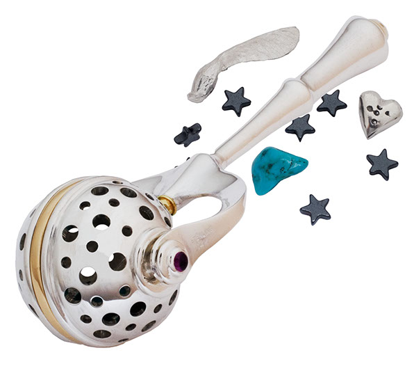 Heirloom Baby Rattle #2, 1999, Detail of contents of the ball for this rattle. Silver, Gold, Gemstones.
