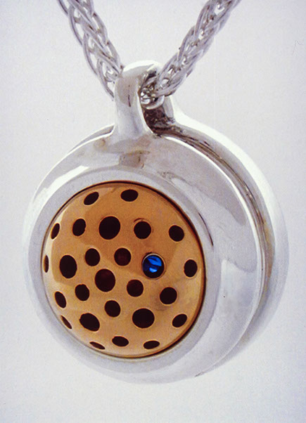Heirloom Wearable Baby Rattle #3, 2000. Front side. Silver, Gold, Gemstones.